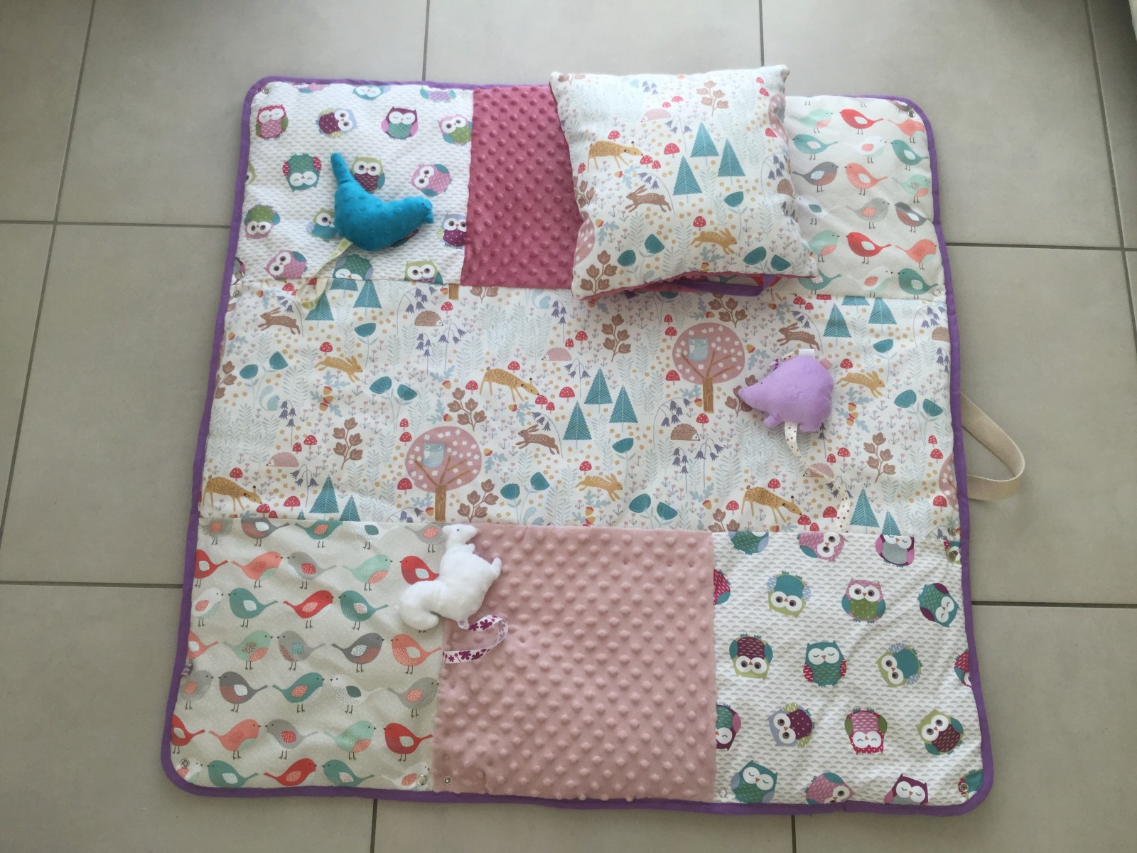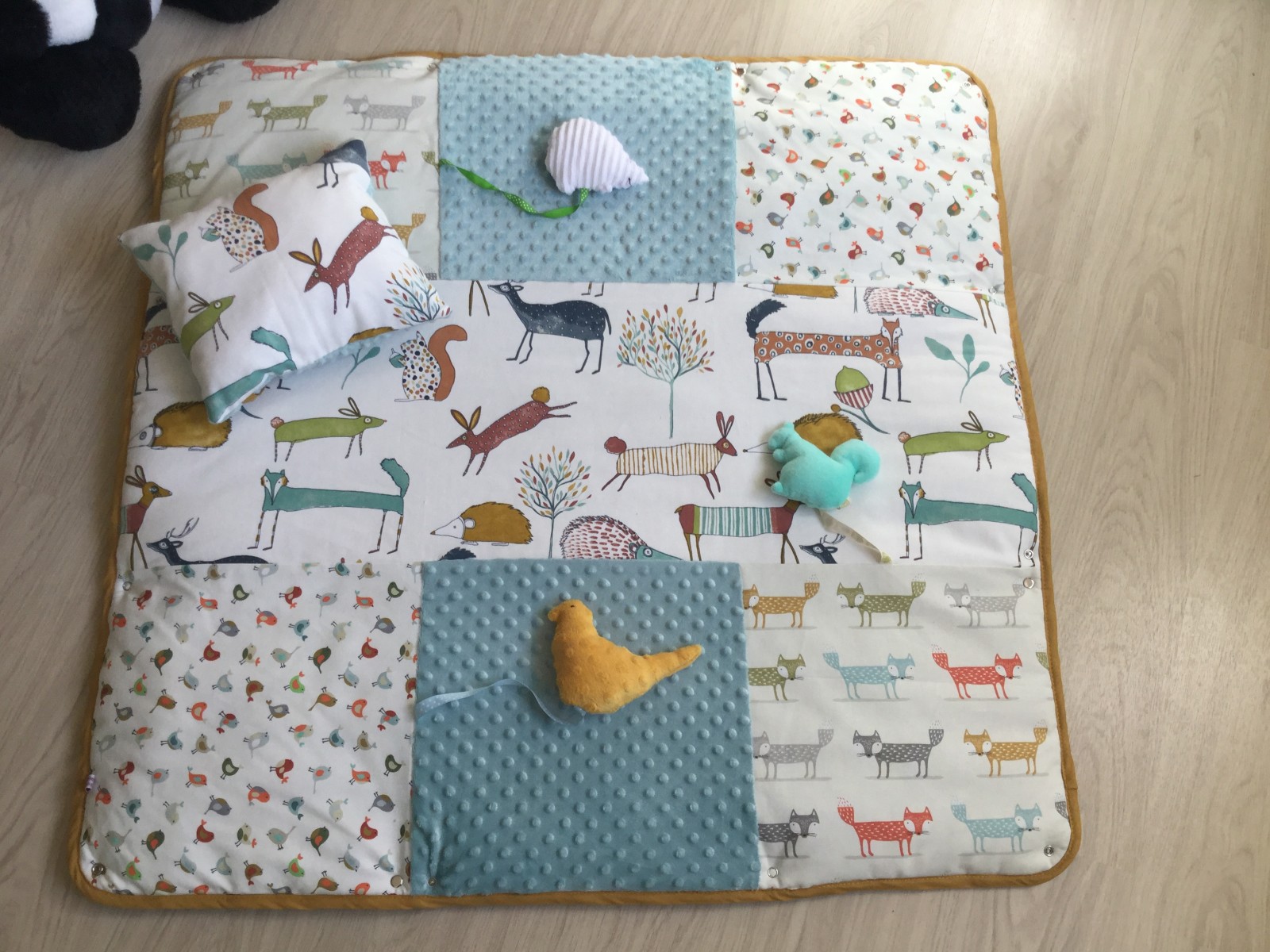 Pour jouer au grand air, le revers est en coton enduit facile à nettoyer avec une éponge ou une lingette. Le tapis passe au lave linge pour un nettoyage plus en profondeur. En fonction de votre choix de motifs, les cotons sont soit des cotons épais soit renforcés avec du thermocollant. Je vous proposerai des tissus labellisés oeko tex. Si vous souhaitez un tissus bien particulier comme le Liberty par exemple, je vous préciserais alors s'il possède ou non le label oeko tex. Deux carrés du tapis ainsi que le revers du coussin sont en minky (polaire très douce et gaufrée) pour la touche douceur.