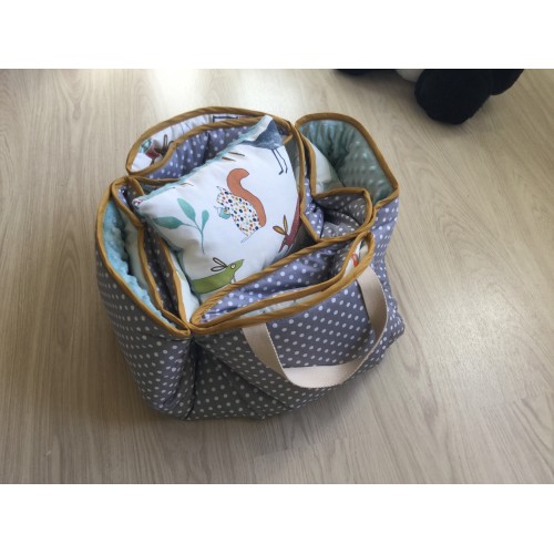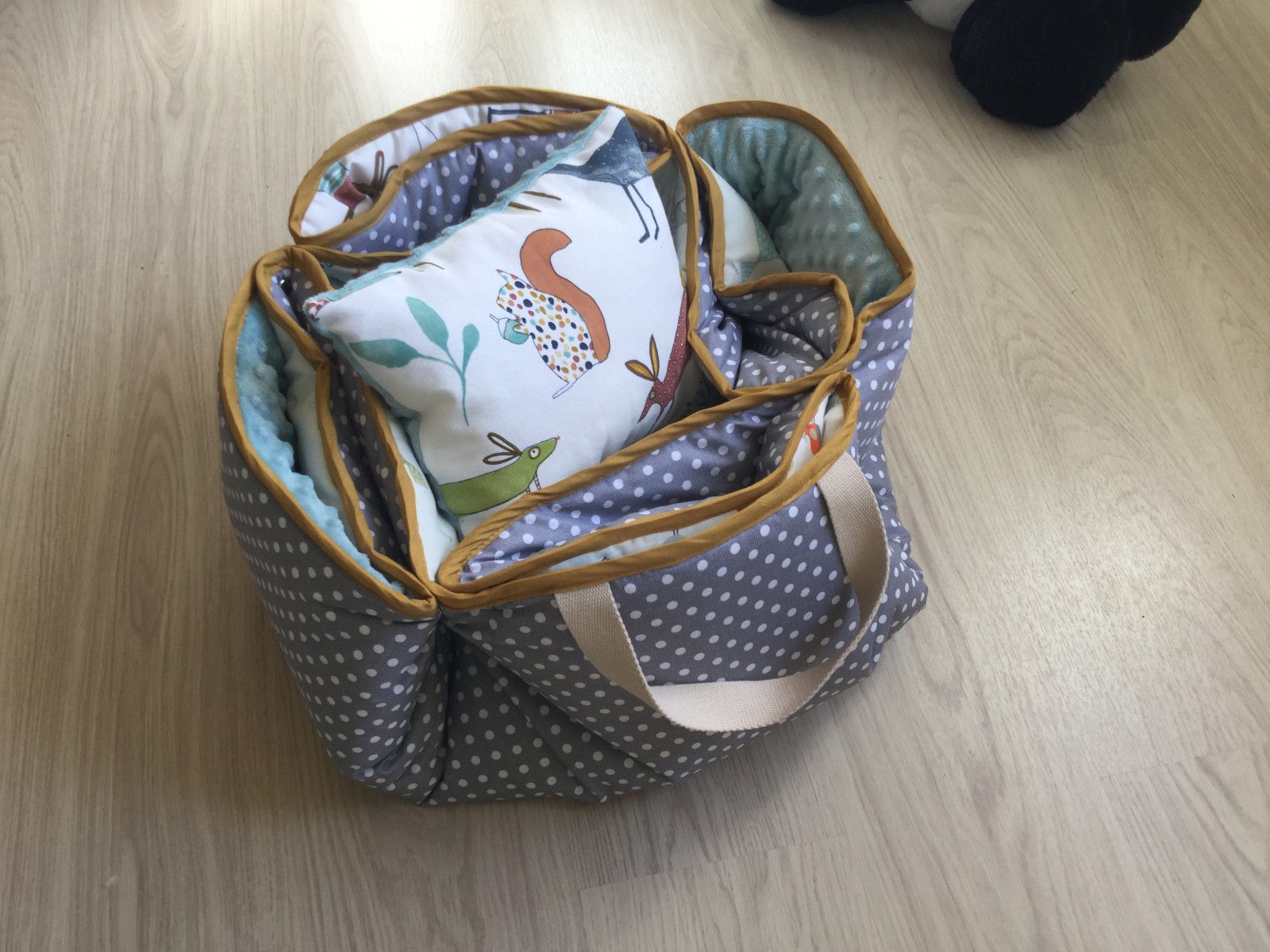 Avec des pressions et deux anses, vous le repliez et le transformez en sac pour emporter les jouets où vous voulez. Des pressions vous permettent également d’accrocher le coussin à une lanière.
