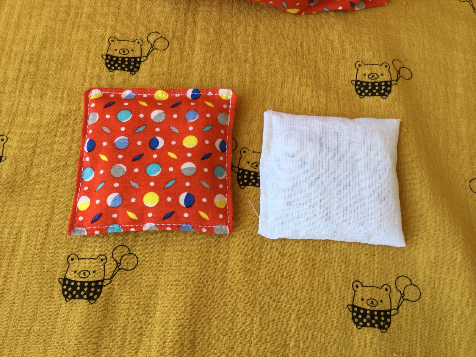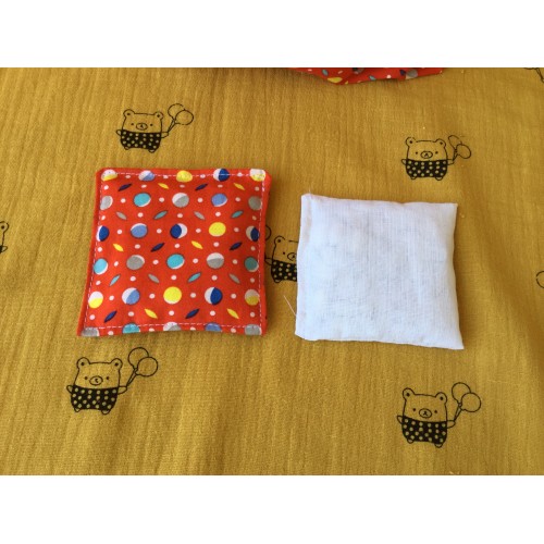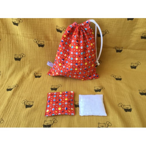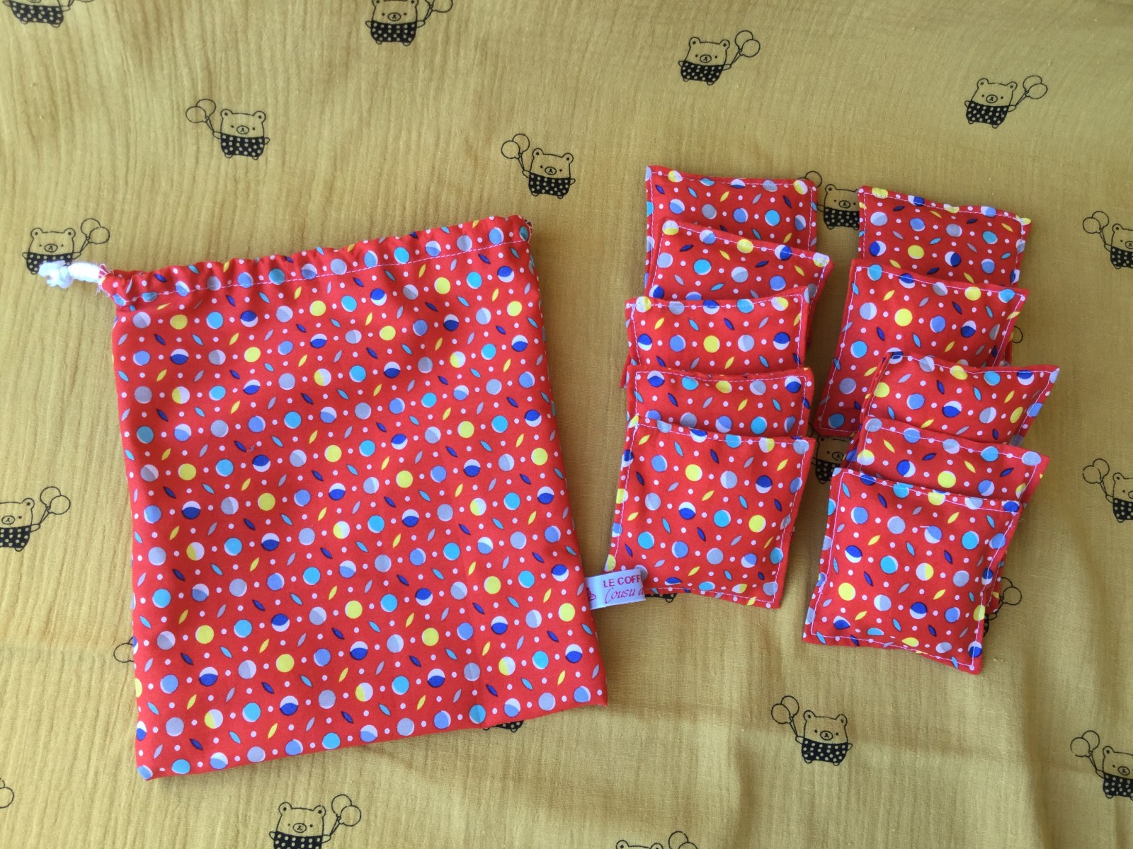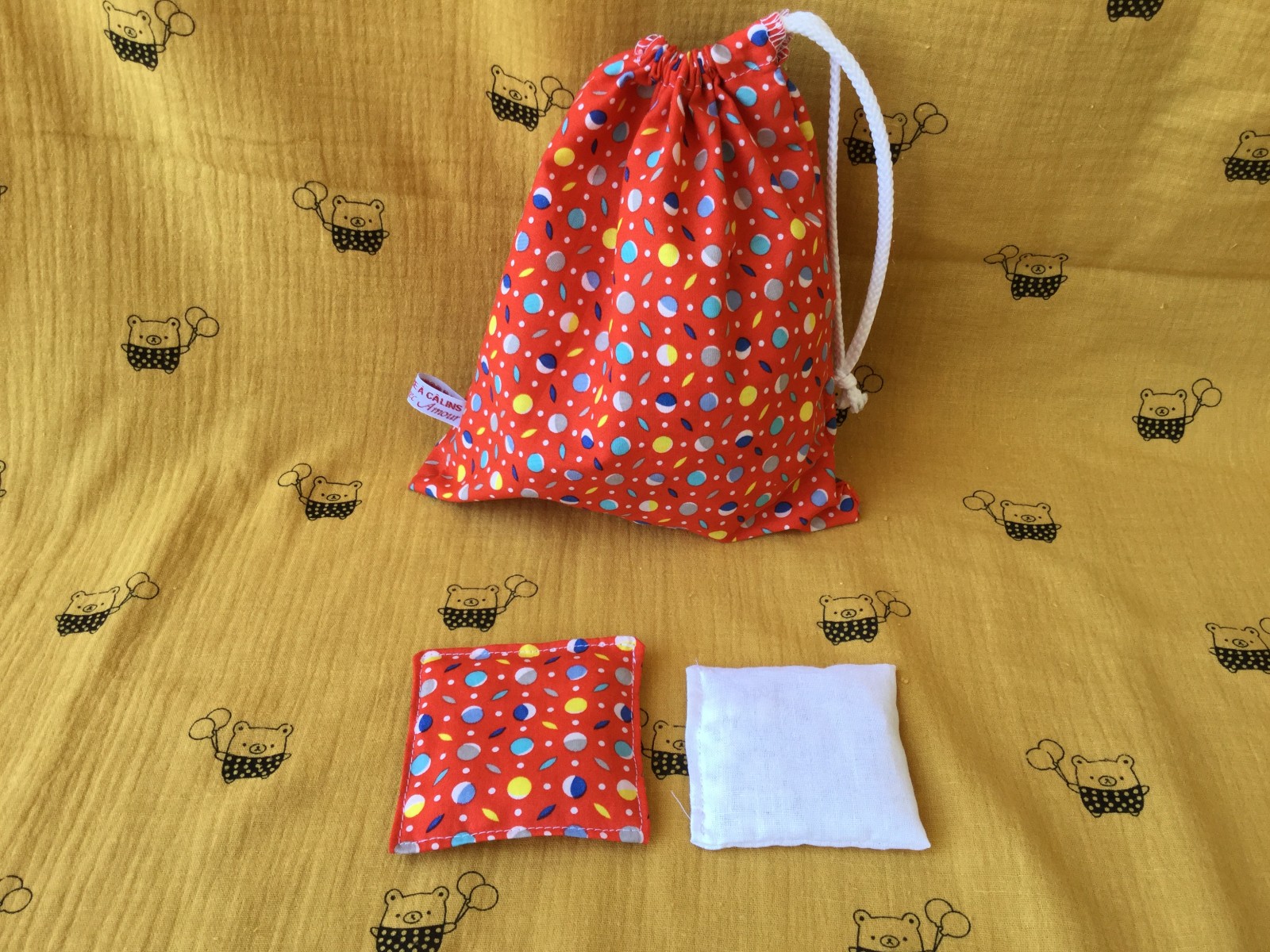 Les coussins sont en coton oeko tex rouge à pois multicolors, garnis par paire de semoule fine, lentilles, noyaux de cerises, petits cailloux et ouate.