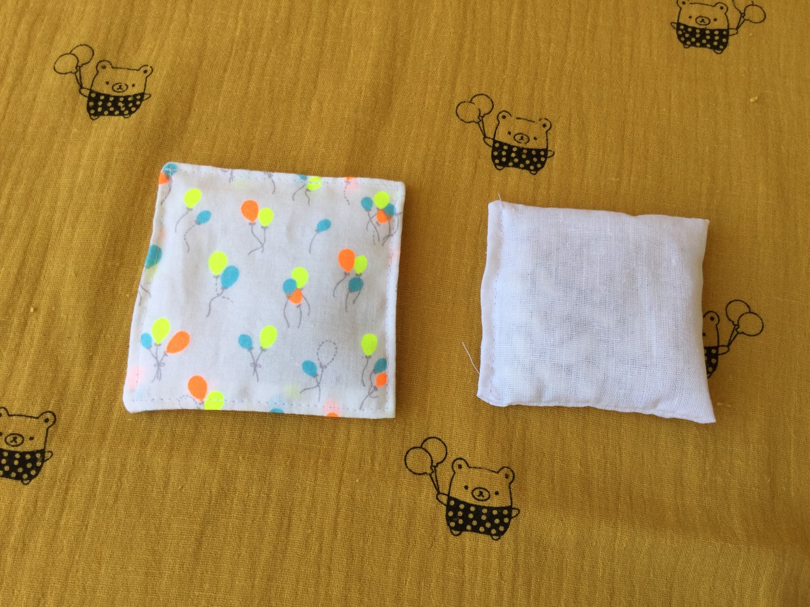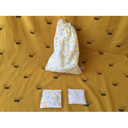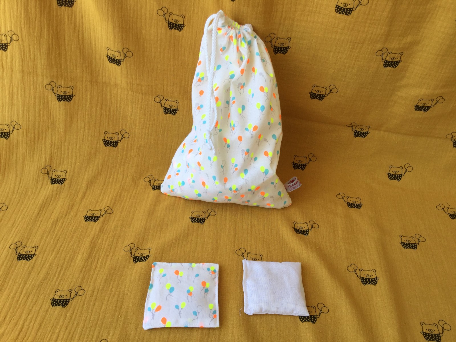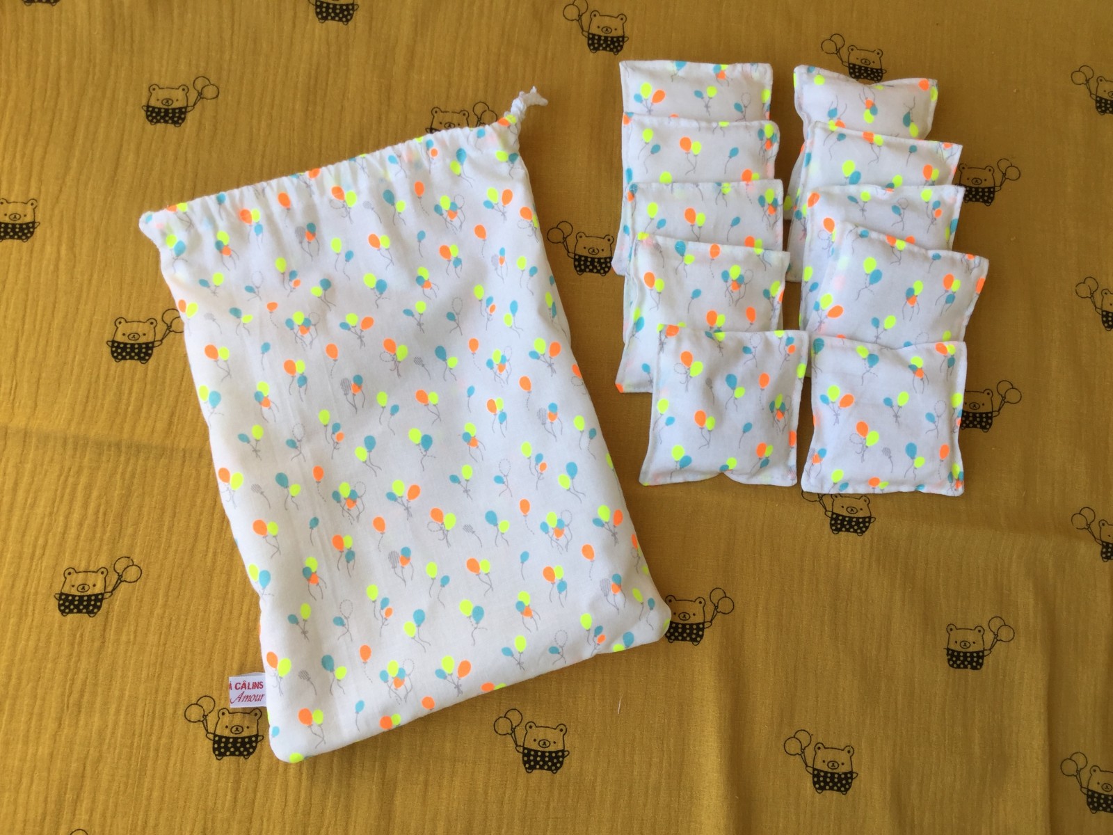 Les coussins sont en coton oeko tex aux motifs ballons, garnis par paire de semoule fine, lentilles, noyaux de cerises, petits cailloux et ouate.