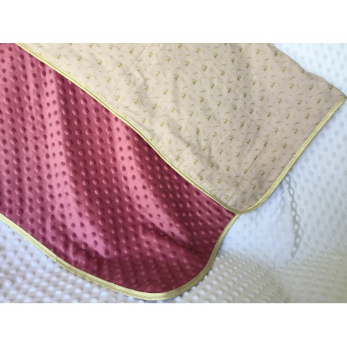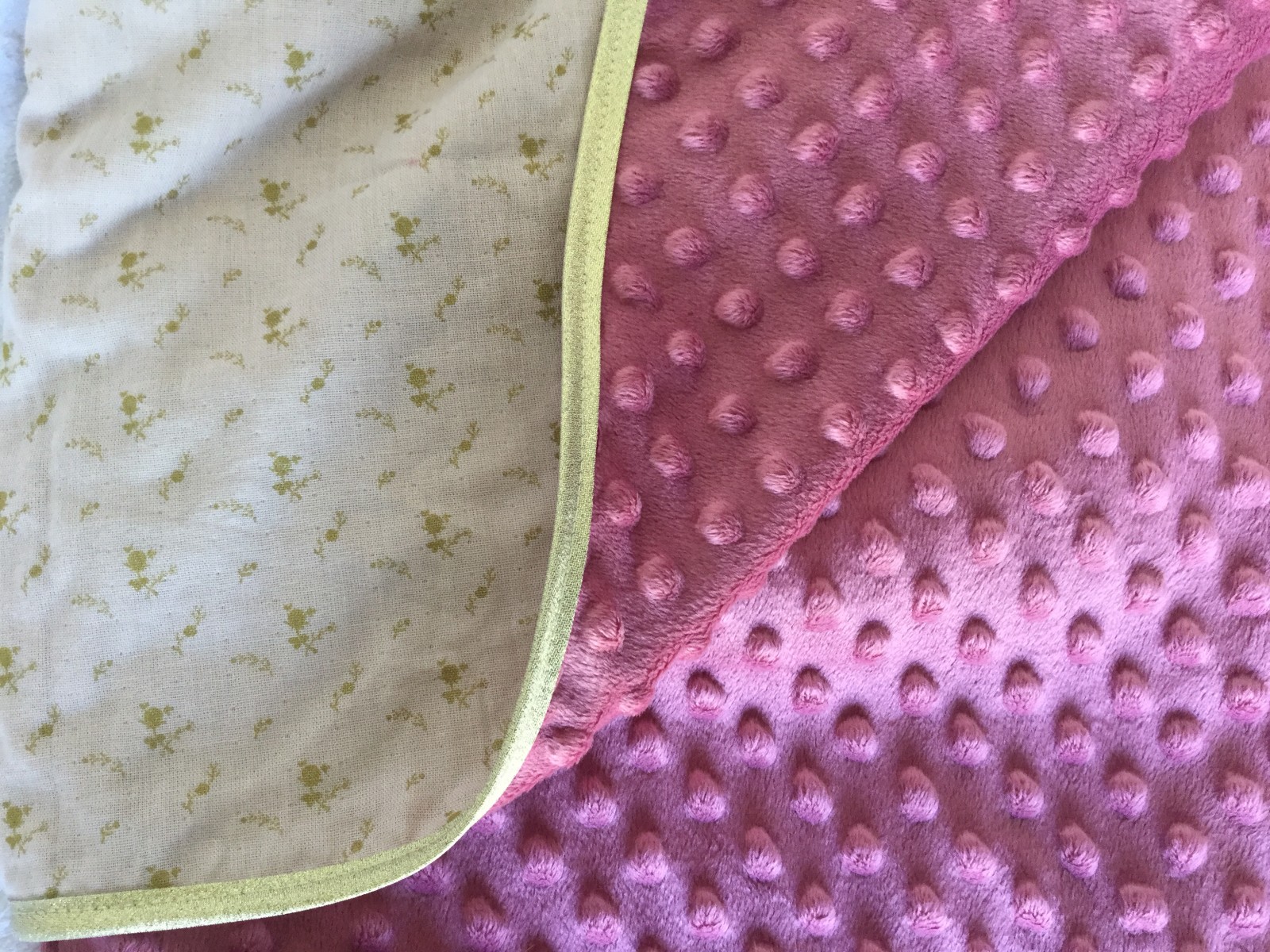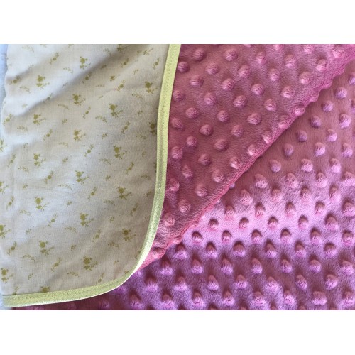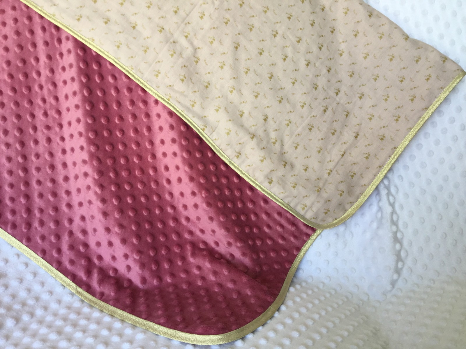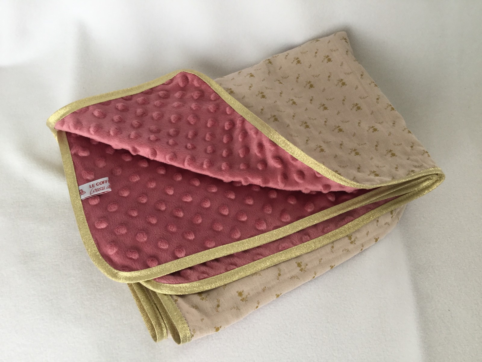 La couverture est doublée d’une polaire minky de couleur rose foncé et est bordée d’un biais doré.