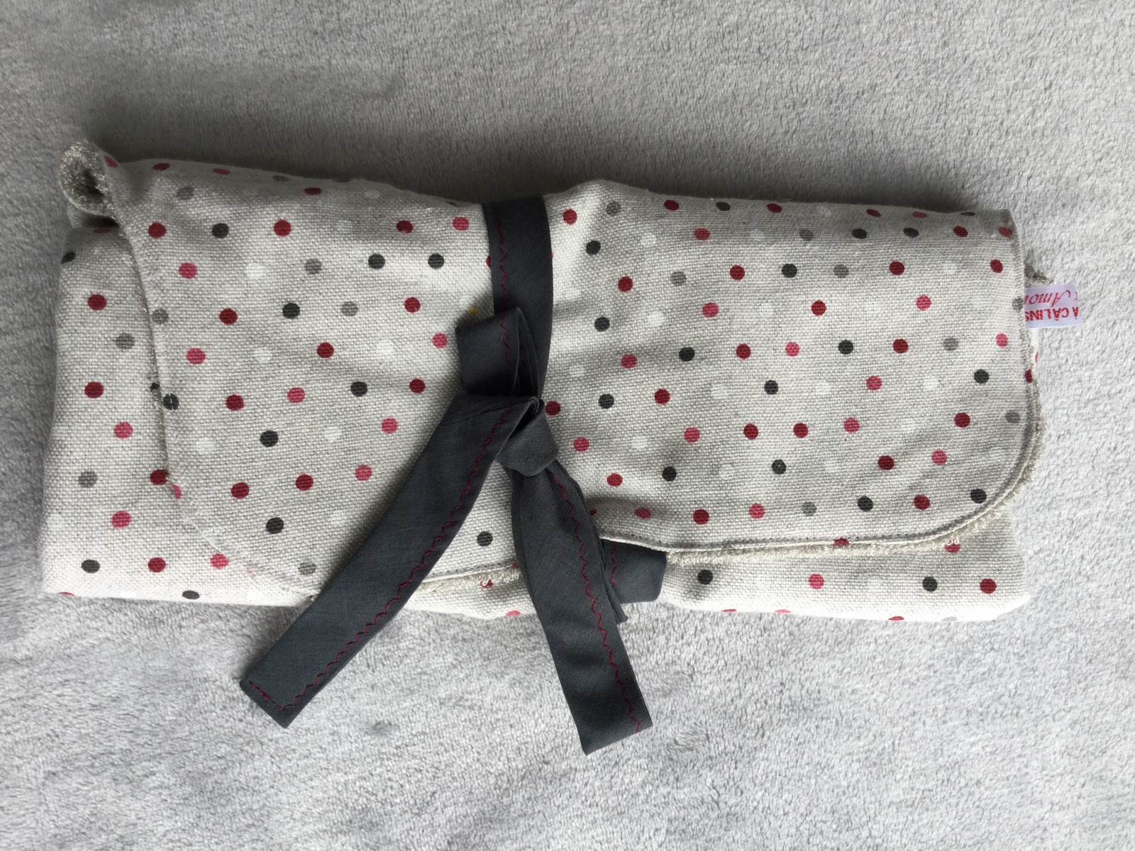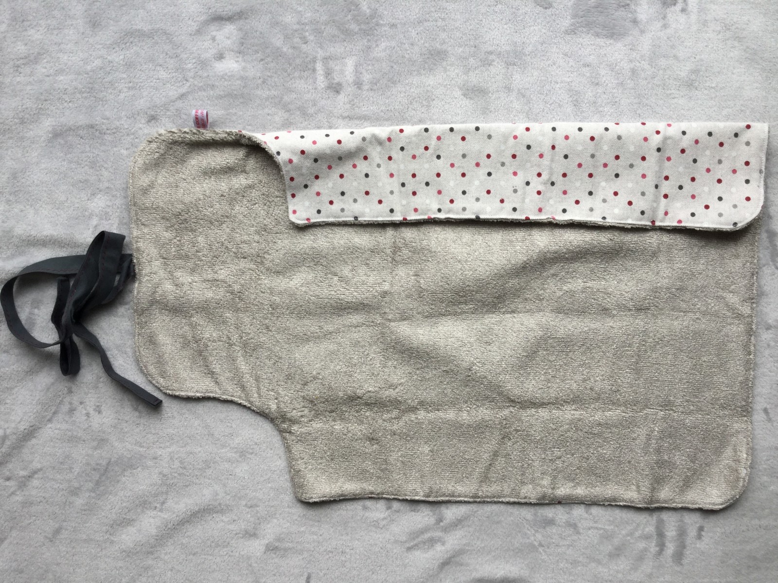 Couleurs lin naturel à pois rosés et éponge de bambou taupe.