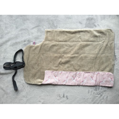 Couleurs rose clair et licornes grises et éponge de bambou taupe.