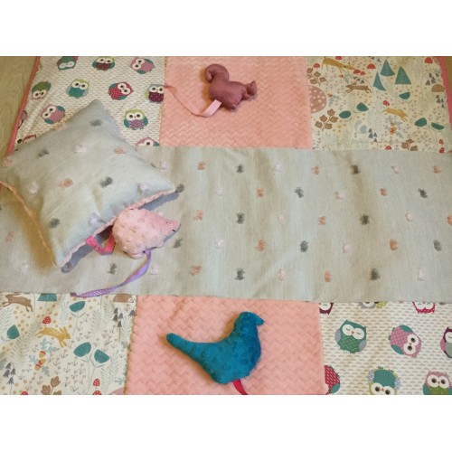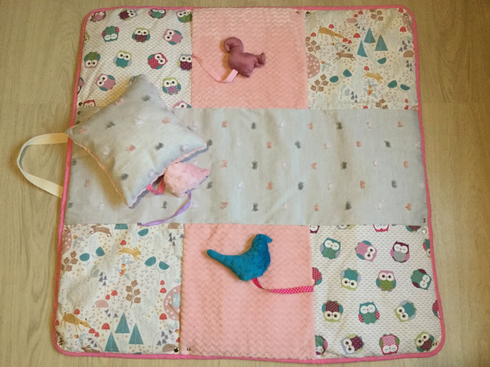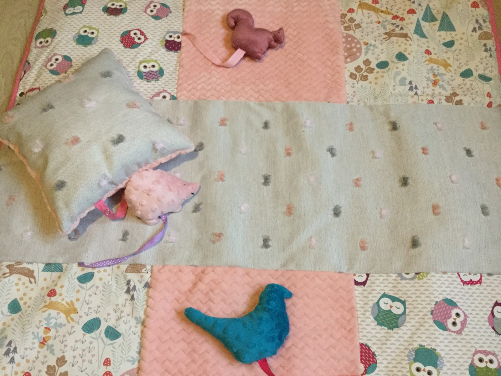Deux carrés représentent des chouettes multicolores, deux autres des motifs d’animaux en forêts, et enfin deux carrés centraux en polaire minky à chevron très doux et sensoriel au toucher.