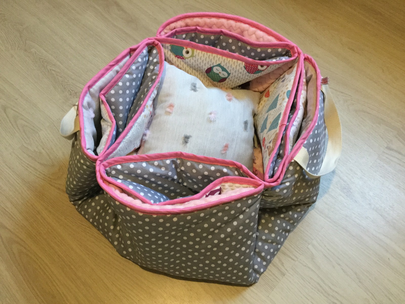 Avec des pressions et deux anses, vous le repliez et le transformez en sac pour emporter les jouets où vous voulez. Des pressions vous permettent également d’accrocher le coussin à une lanière.